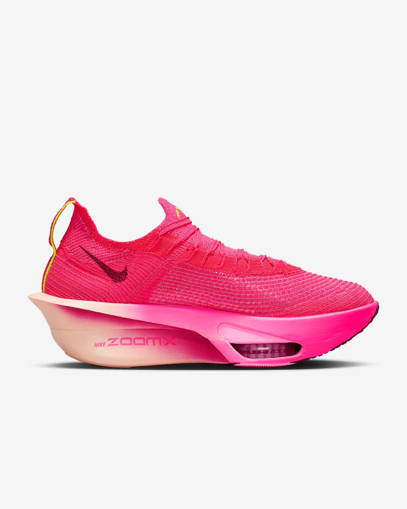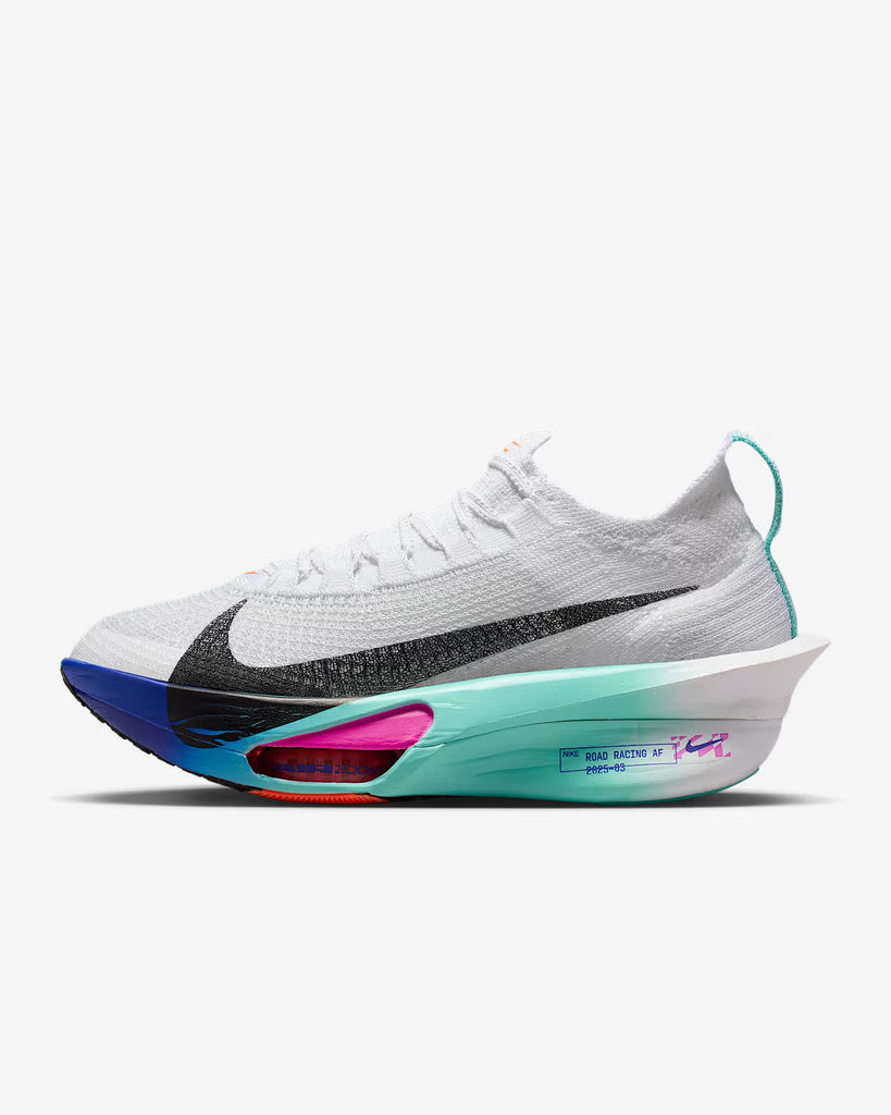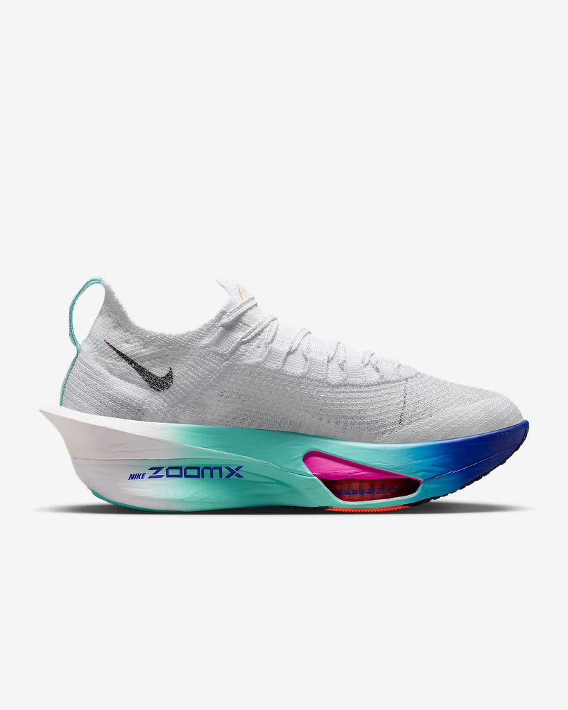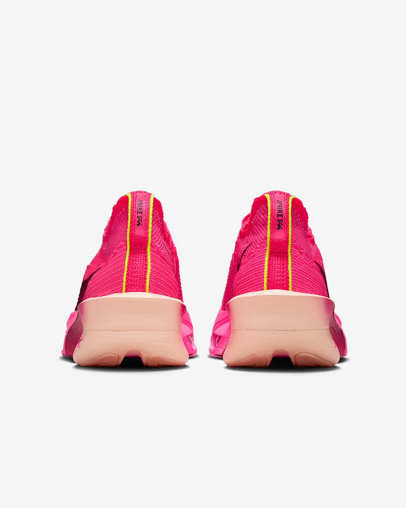 Nike Alphafly 3 Womens' Road Racing Shoes Fine-tuned for marathon speed, the Alphafly 3 helps push you beyond what you thought possible. Three innovative technologies power your run: A double dose of Air Zoom units helps launch you into your next step; a full-length carbon fiber plate helps propel you forward with ease; and a heel-to-toe ZoomX foam midsole helps keep you fresh from start to 26.2. Time to leave your old personal records in the dust. Energy Return for Your Marathon Two forefoot Air Zoom units combine with ZoomX foam to store and return the energy back to you, powering every step. Propulsive Feeling A full-length carbon fiber plate delivers a propulsive sensation that helps you smoothly transition through every stride and tackle turns with confidence. Cushioned Ride Fully connected ZoomX foam creates an ultralight and cushioned feel, helping you stay fresh and comfortable from KM 1 to 42.2. What's New About the Alphafly 3? The Alphafly 3 is Nike's lightest Alphafly ever, featuring a slightly wider carbon fiber plate for increased stability, a fully connected ZoomX foam midsole for smoother transitions and an all-new Atomknit upper designed for improved multidirectional containment and breathability. Notched laces offer a secure but soft lace-up. An integrated knit tongue with lofted padding helps alleviate lace pressure.