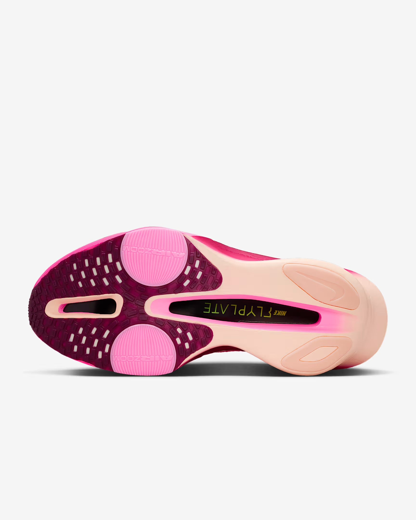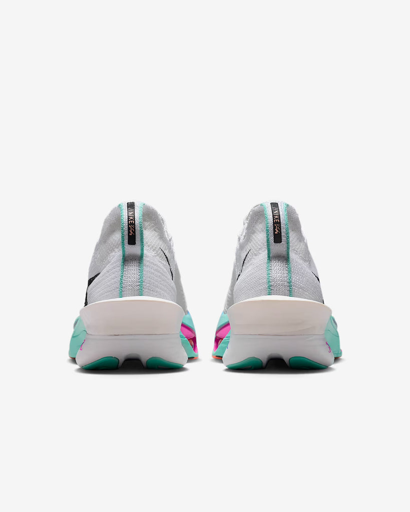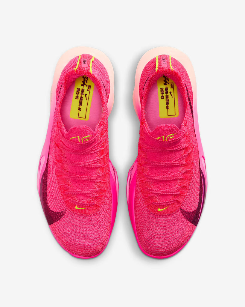 Nike Alphafly 3 Womens' Road Racing Shoes Fine-tuned for marathon speed, the Alphafly 3 helps push you beyond what you thought possible. Three innovative technologies power your run: A double dose of Air Zoom units helps launch you into your next step; a full-length carbon fiber plate helps propel you forward with ease; and a heel-to-toe ZoomX foam midsole helps keep you fresh from start to 26.2. Time to leave your old personal records in the dust. Energy Return for Your Marathon Two forefoot Air Zoom units combine with ZoomX foam to store and return the energy back to you, powering every step. Propulsive Feeling A full-length carbon fiber plate delivers a propulsive sensation that helps you smoothly transition through every stride and tackle turns with confidence. Cushioned Ride Fully connected ZoomX foam creates an ultralight and cushioned feel, helping you stay fresh and comfortable from KM 1 to 42.2. What's New About the Alphafly 3? The Alphafly 3 is Nike's lightest Alphafly ever, featuring a slightly wider carbon fiber plate for increased stability, a fully connected ZoomX foam midsole for smoother transitions and an all-new Atomknit upper designed for improved multidirectional containment and breathability. Notched laces offer a secure but soft lace-up. An integrated knit tongue with lofted padding helps alleviate lace pressure.