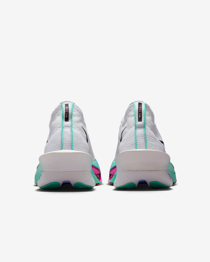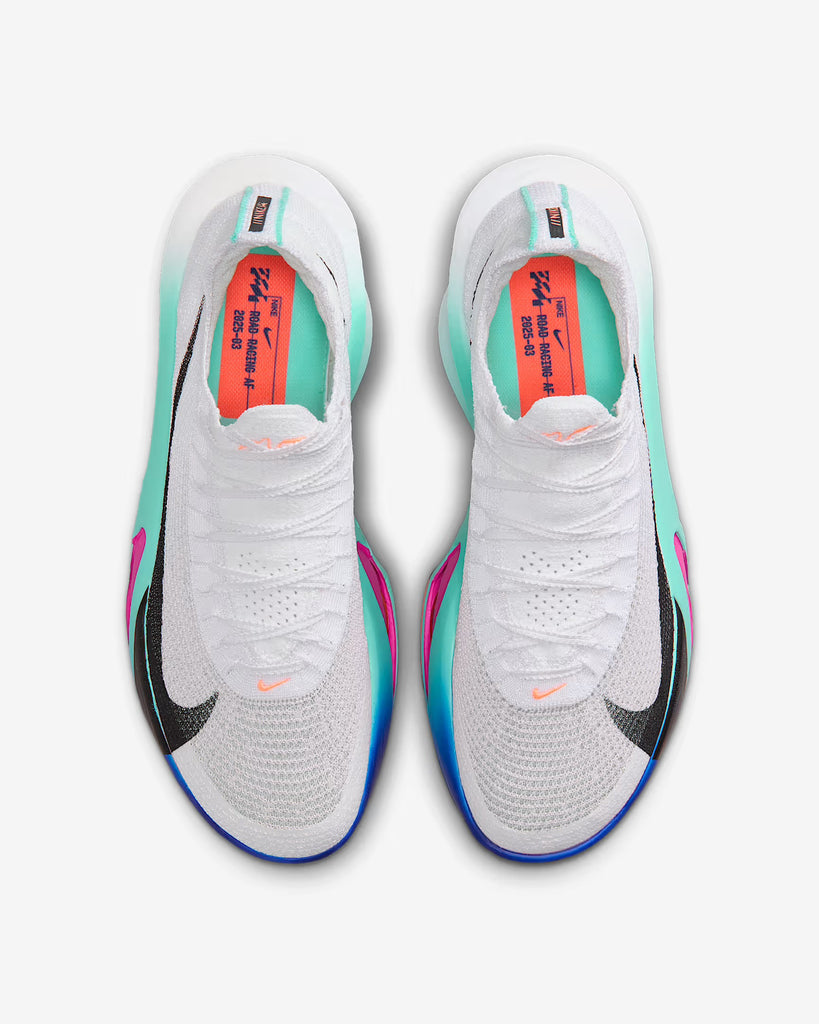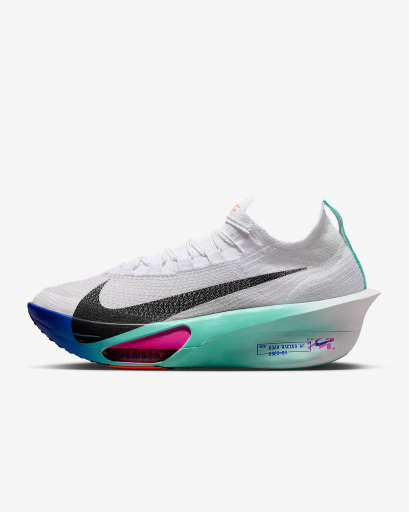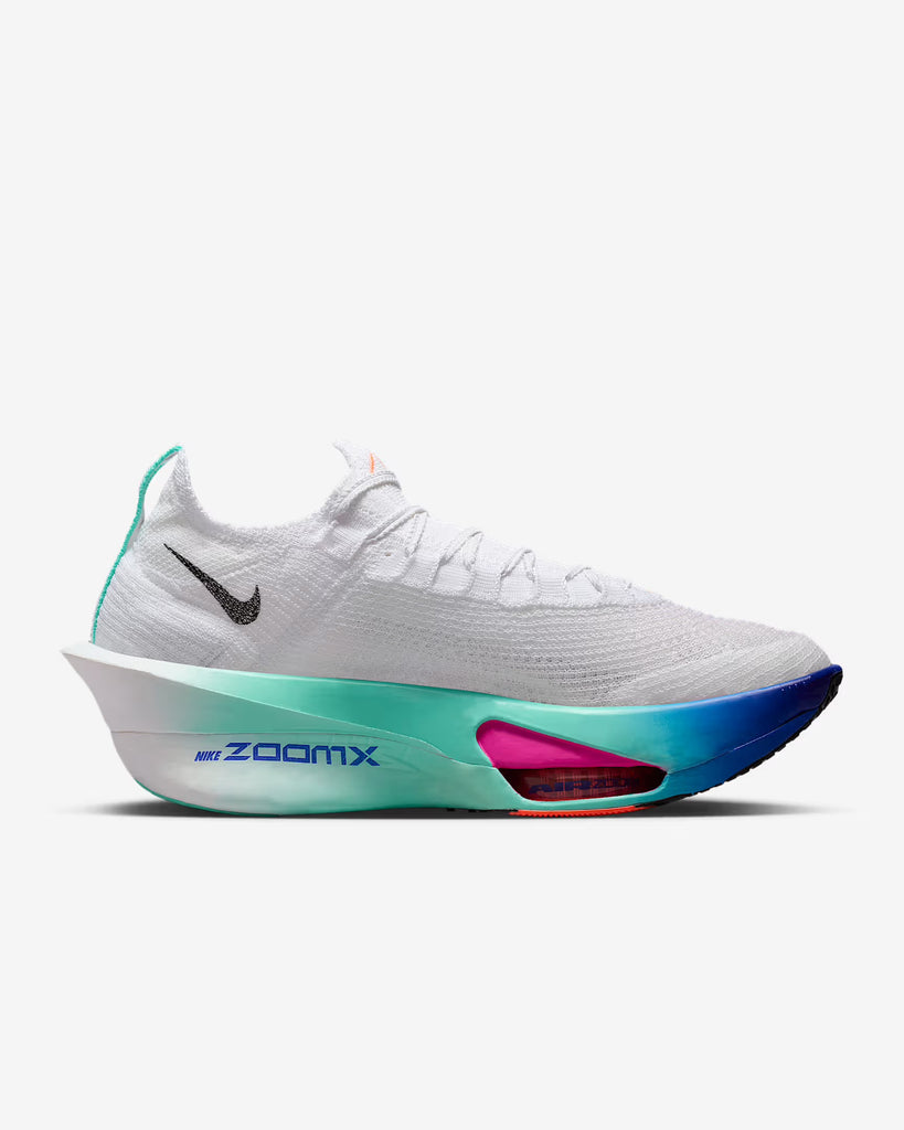 Nike Alphafly 3 Men's Road Racing Shoes Fine-tuned for marathon speed, the Alphafly 3 helps push you beyond what you thought possible. Three innovative technologies power your run: A double dose of Air Zoom units helps launch you into your next step; a full-length carbon fiber plate helps propel you forward with ease; and a heel-to-toe ZoomX foam midsole helps keep you fresh from start to 26.2. Time to leave your old personal records in the dust. Energy Return for Your Marathon Two forefoot Air Zoom units combine with ZoomX foam to store and return the energy back to you, powering every step. Propulsive Feeling A full-length carbon fiber plate delivers a propulsive sensation that helps you smoothly transition through every stride and tackle turns with confidence. Cushioned Ride Fully connected ZoomX foam creates an ultralight and cushioned feel, helping you stay fresh and comfortable from km 1 to 42.2. What's New About the Alphafly 3? The Alphafly 3 is Nike's lightest Alphafly ever, featuring a slightly wider carbon fiber plate for increased stability, a fully connected ZoomX foam midsole for smoother transitions and an all-new Atomknit upper designed for improved multidirectional containment and breathability. Notched laces offer a secure but soft lace-up. An integrated knit tongue with lofted padding helps alleviate lace pressure.
