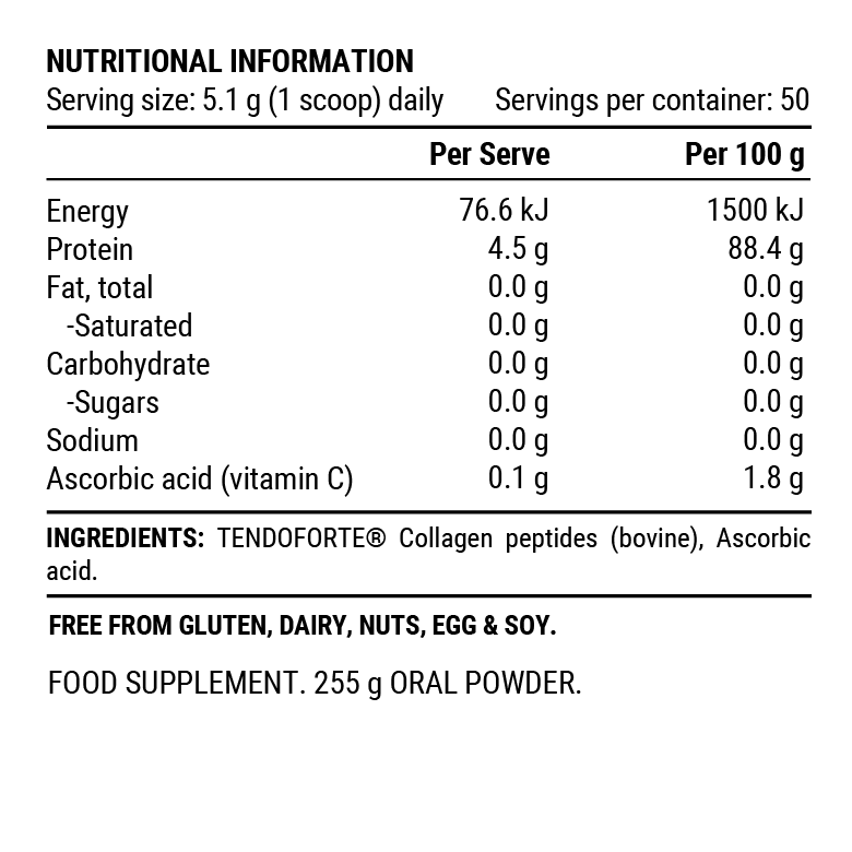 COLLAGEN REPAIR features clinically trialled Tendoforte® bio-active peptides that have been shown to positively affect the strength and health of tendons and ligaments during physical activity.